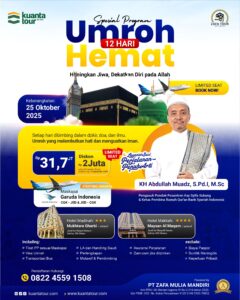 Assalamu’alaikum, Sobat Kuanta! Sudah punya niat suci untuk berumroh tahun ini? Kuanta Tour by Zafa kembali hadir dengan penawaran istimewa: Program Umroh Hemat 12 Hari yang dirancang khusus agar ibadahmu nyaman, hati tentram, dan penuh makna! Insya Allah, perjalanan ke Tanah Suci kali ini akan menjadi momen untuk menghingkan jiwa